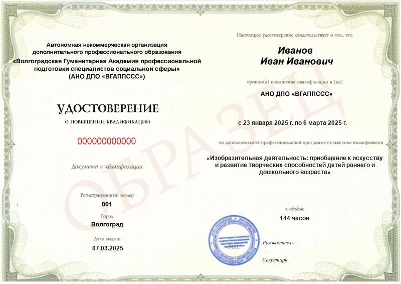 Обучение по такой программе – способ освоить новую профессию на основе ранее полученного образования. В дипломе выпускника указывается его ФИО, наименование учебной организации, название и длительность программы. Документ заверяется подписью руководителя и печатью АНО ДПО «ВГАППССС».