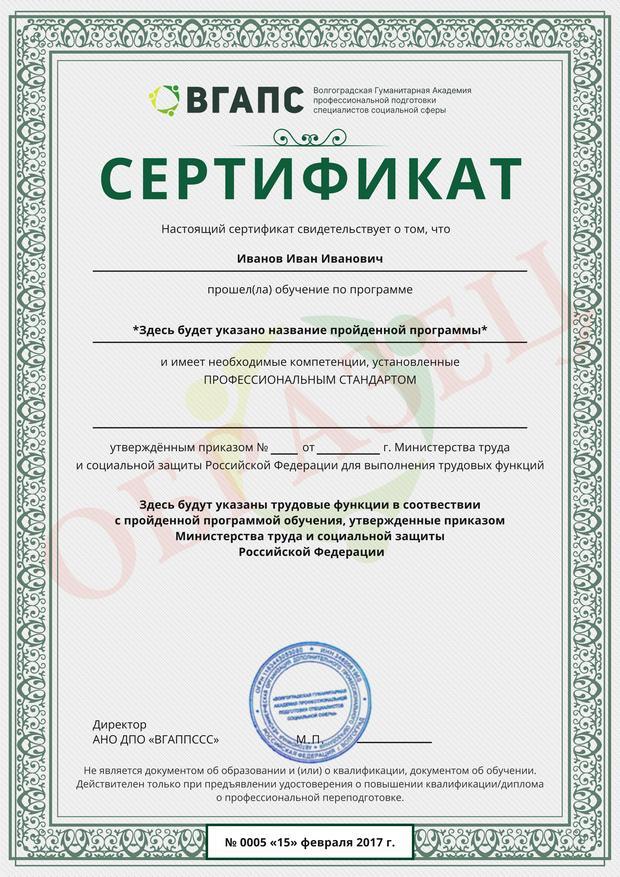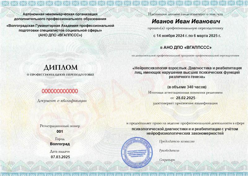 Обучение по такой программе – способ освоить новую профессию на основе ранее полученного образования. В дипломе выпускника указывается его ФИО, наименование учебной организации, название и длительность программы. Документ заверяется подписью руководителя и печатью АНО ДПО «ВГАППССС».